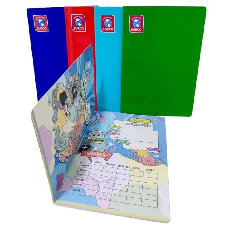 Disponible en distintos tamaños (como A4, A5 o carta), este cuaderno puede contener hojas rayadas, cuadriculadas o lisas, impresas sobre papel de buena calidad. Suele tener entre 80 y 100 hojas, con márgenes definidos y, en algunos casos, incluye separadores, carátulas para información personal o calendarios.